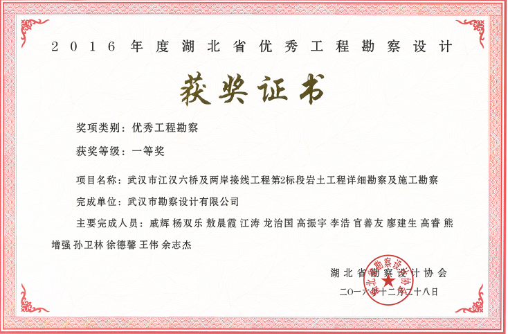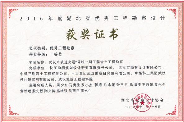 軌道交通2號(hào)線一期工程巖土工程勘察獲2016年度湖北省優(yōu)秀工程勘
