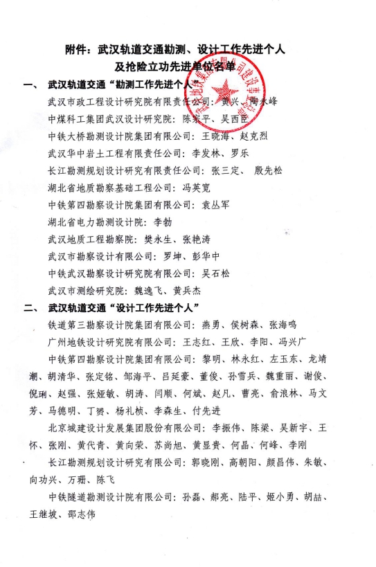 鑒于我公司在武漢市軌道交通3號線香惠區(qū)間地面塌陷搶險工作中的突出表現(xiàn),武漢地鐵集團有限公司建設事業(yè)總部授予我公司等6家勘察、設計單位“搶險立功先進單位”榮譽稱號。其中我公司在各單位中排在第一位。為激發(fā)武漢交通勘測、設計單位技術管理骨干的責任心和榮譽感,授予我公司羅坤、彭華中2位同志武漢軌道交通“勘測先進個人”。(巖土一公司)