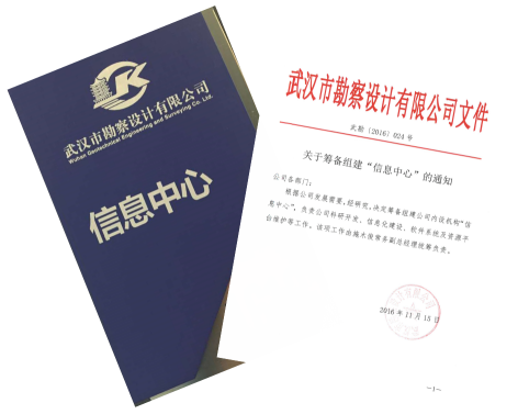 2017年1月1日,武漢市勘察設(shè)計(jì)有限公司正式下文成立信息中心,主要負(fù)責(zé)公司科研開(kāi)發(fā)、信息化建設(shè)、軟件系統(tǒng)及資源平臺(tái)維護(hù)等工作。